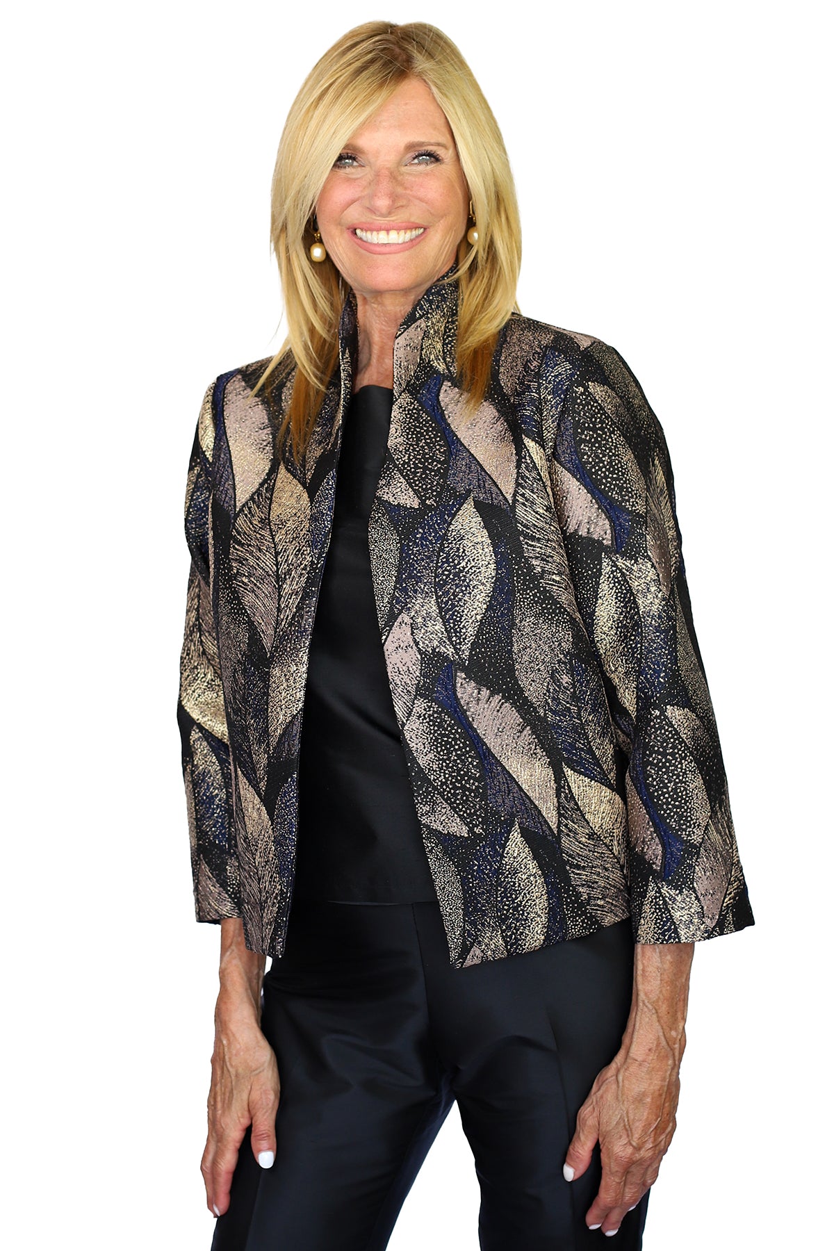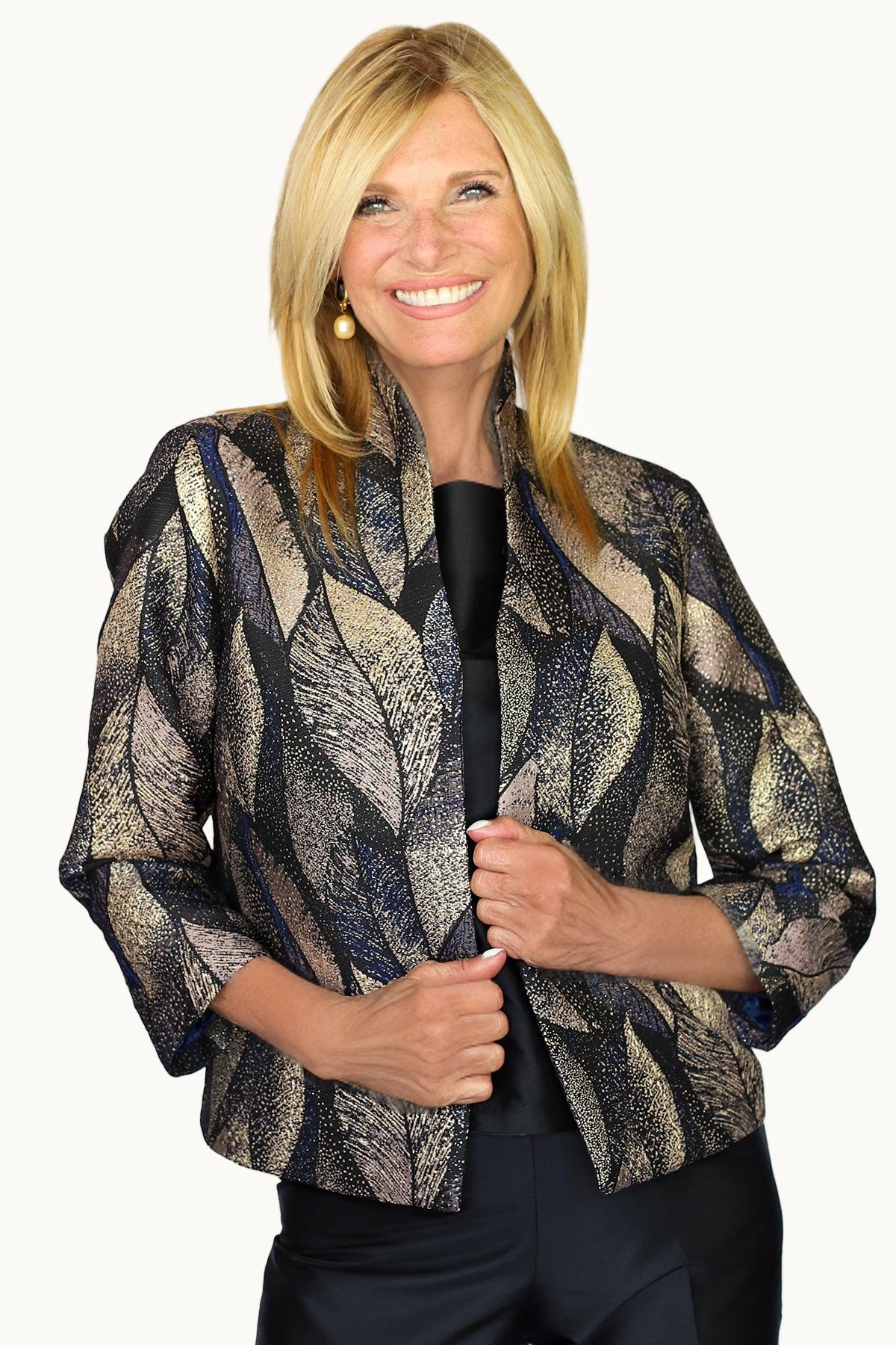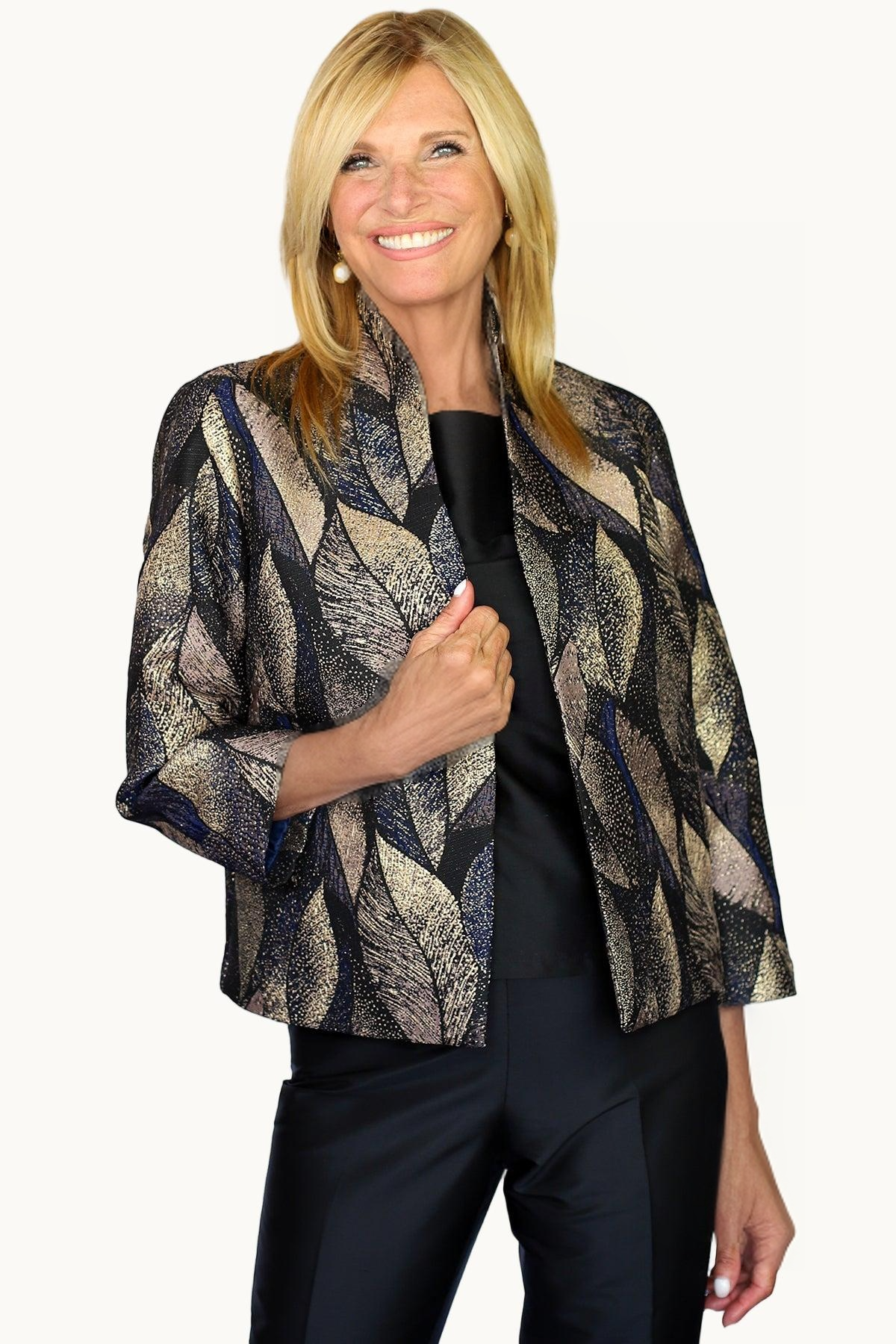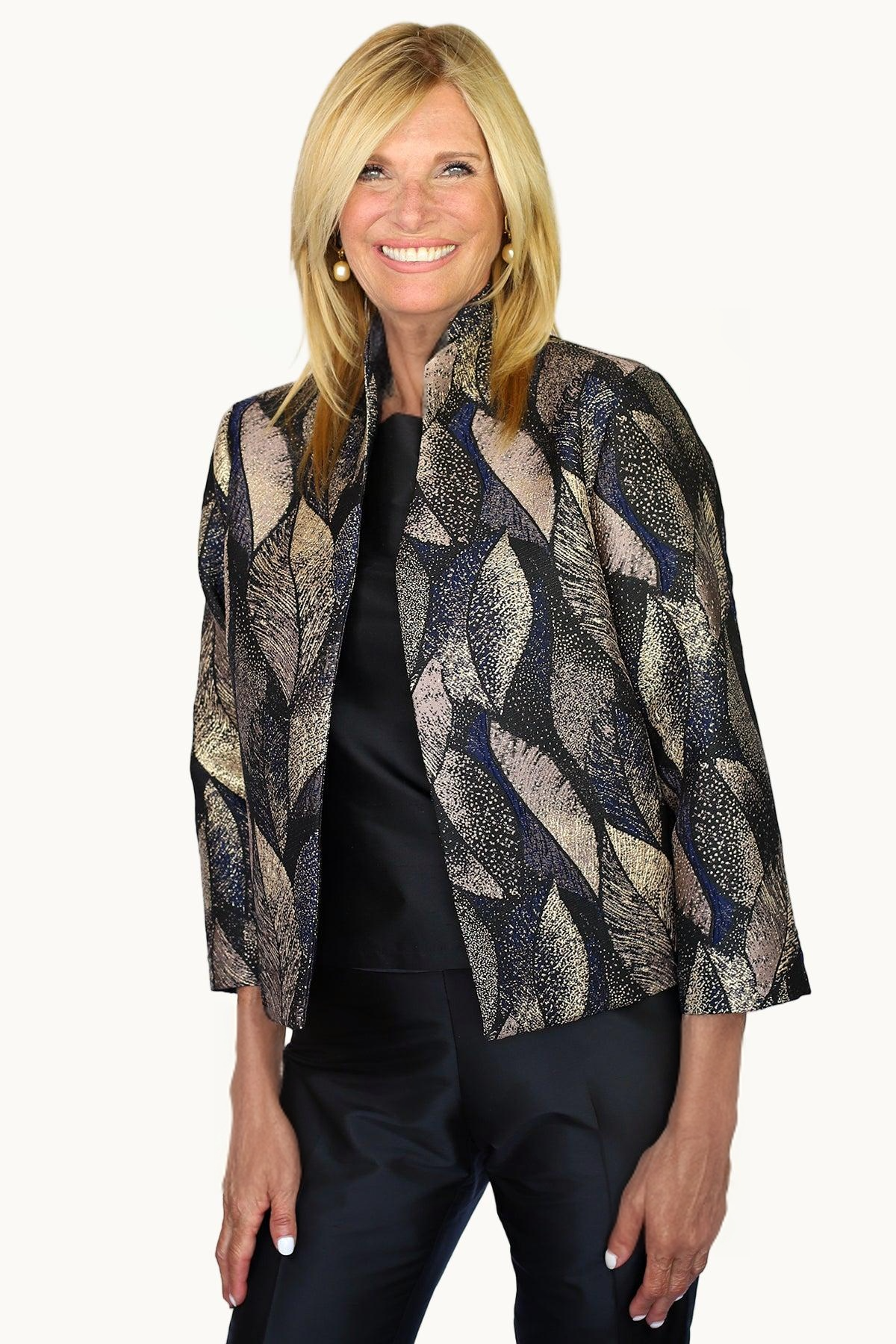 Our Versatile Roxy Jacket Updated for Fall in Our New Poly/Silk Autumn Leaf Fabric.