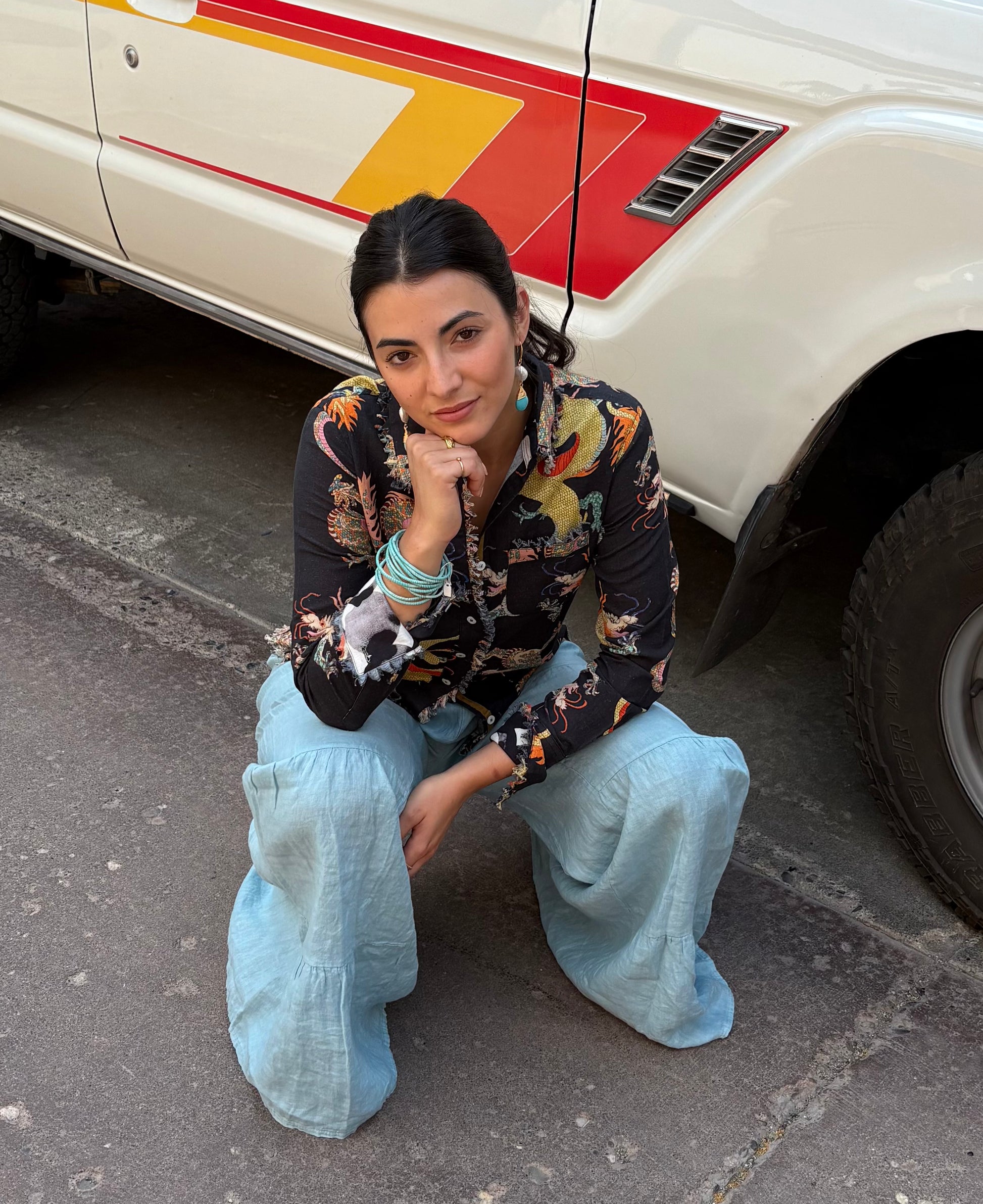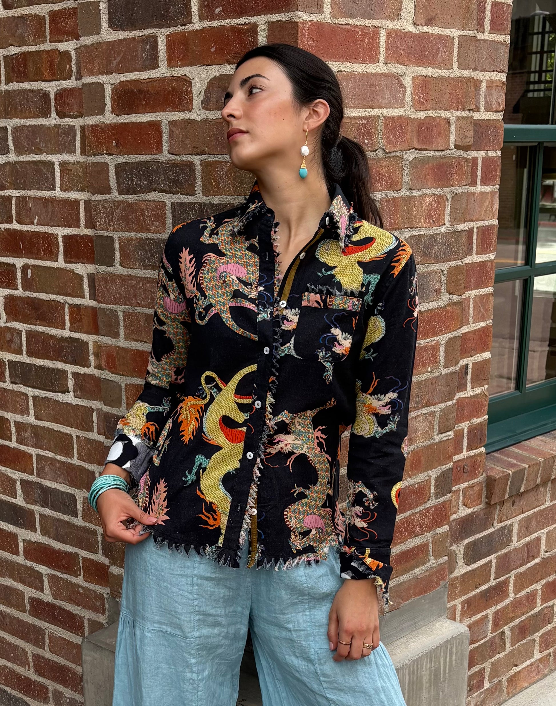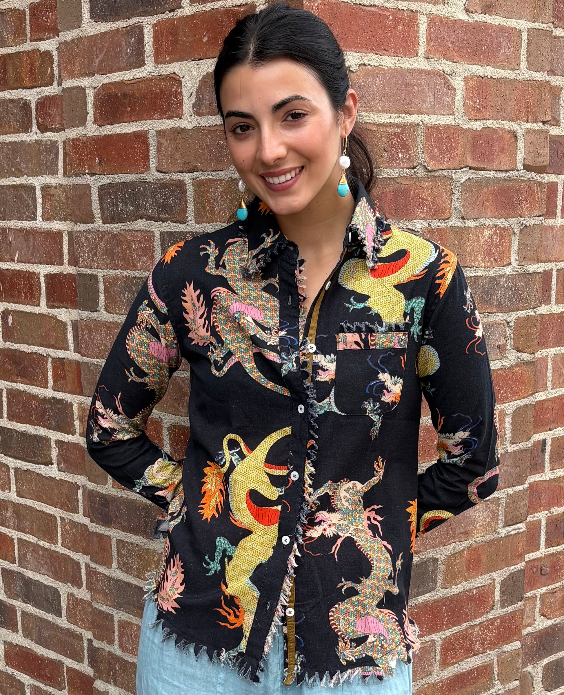 One of our boutiques best sellers, the black top is made from 100% Cotton & Linen, beautifully decorated with dancing dragons embodying elements of strength and prosperity. With a perfect balance of style and comfort, this top will boost your confidence falling on the body like a flawless frame for a painted master piece! Both people and Fashion are an art form like no other, so treat yourself like the jewel you truly are!