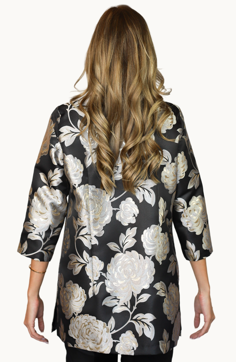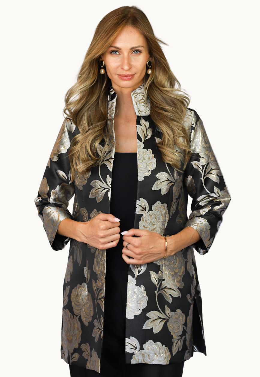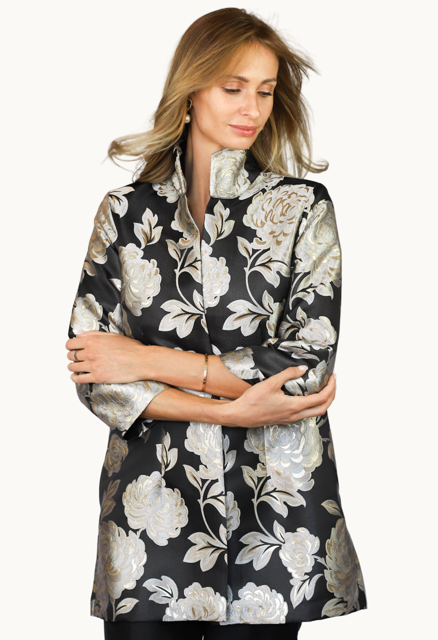 Our stunning Maisel Rita made from Polysilk and Metallic fabric! This piece features a silver & black floral pattern inspired by the enchanting chrysanthemum bloom. On the petals lay gold accents that replicate morning dew highlighted by the deep black background.