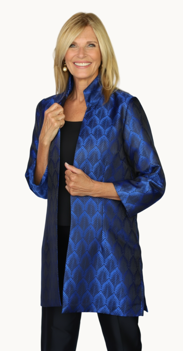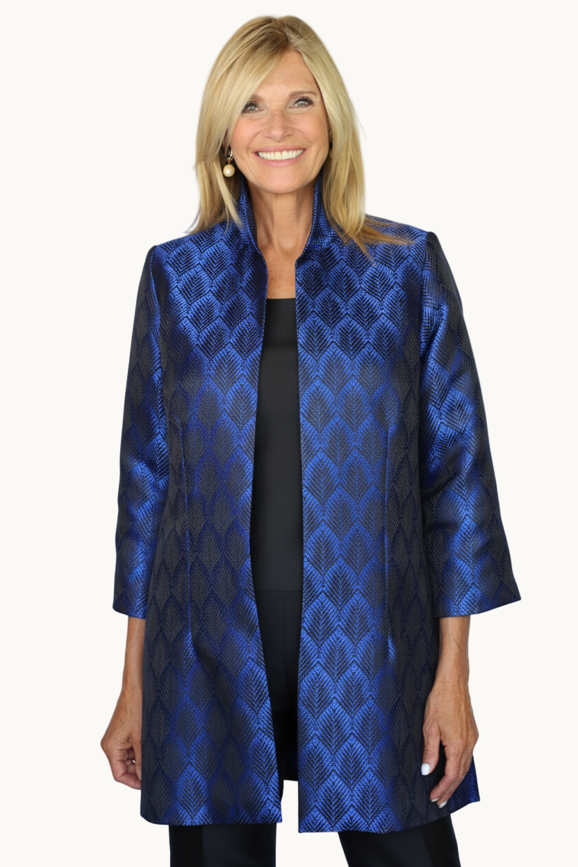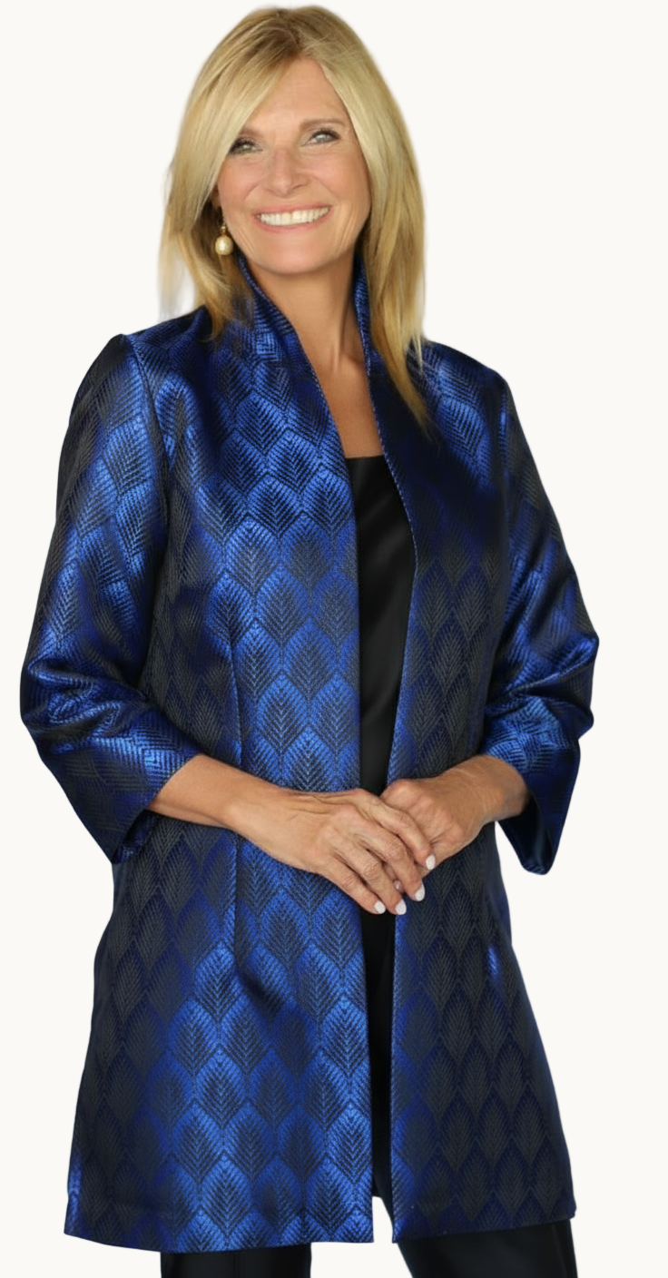Our enchanting Rita made from Mika and Polysilk fabric, ornamented with geometric feather like pattern featuring the shadows and highlights of a deep royal blue.