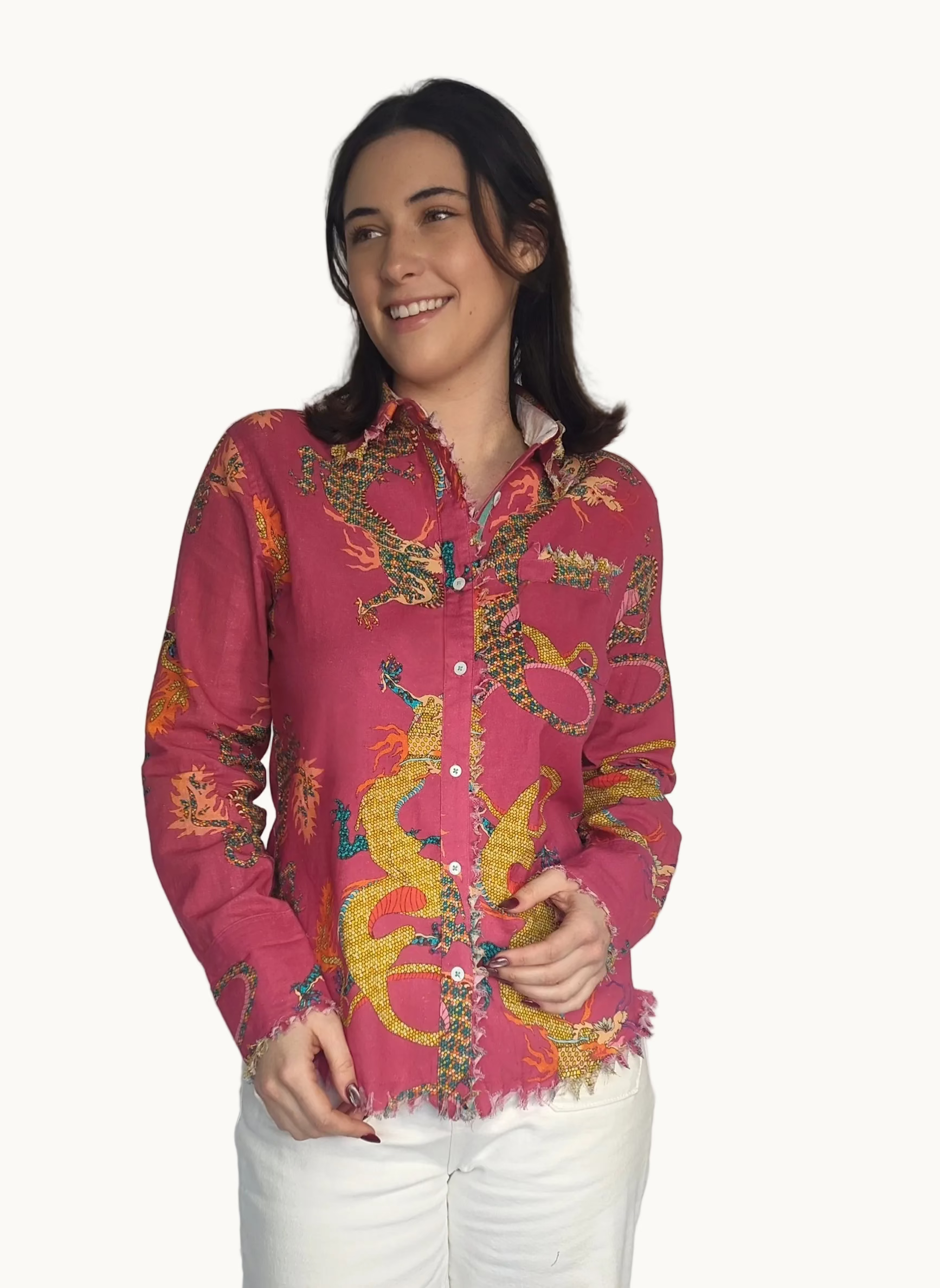 One of our boutiques best sellers, this mulberry pink top is made from 100% Cotton & Linen, beautifully decorated with dancing dragons embodying elements of strength and prosperity. With a perfect balance of style and comfort, this top will boost your confidence falling on the body like a flawless frame for a painted master piece! Both people and Fashion are an art form like no other, so treat yourself like the jewel you truly are!
