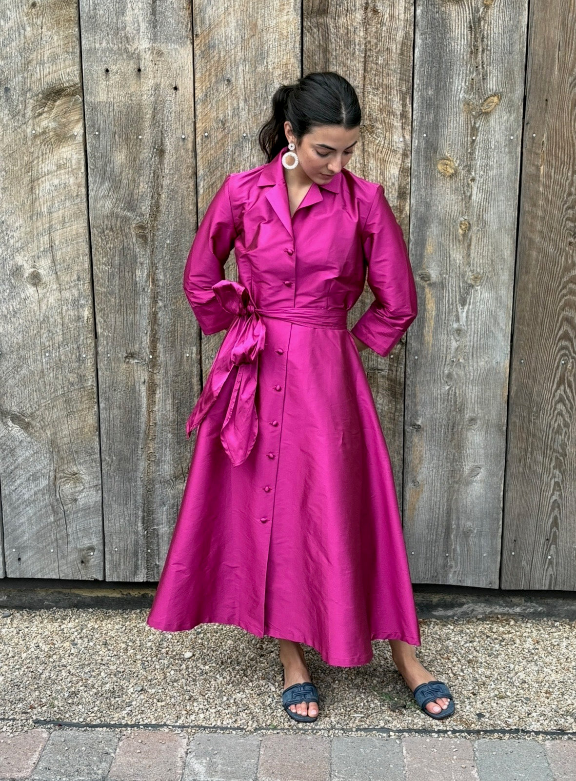 The Scarlet Dress! A beautiful shirtwaist dress that works for any upscale event! Shown in our Raspberry Mac Fadden Taffeta.