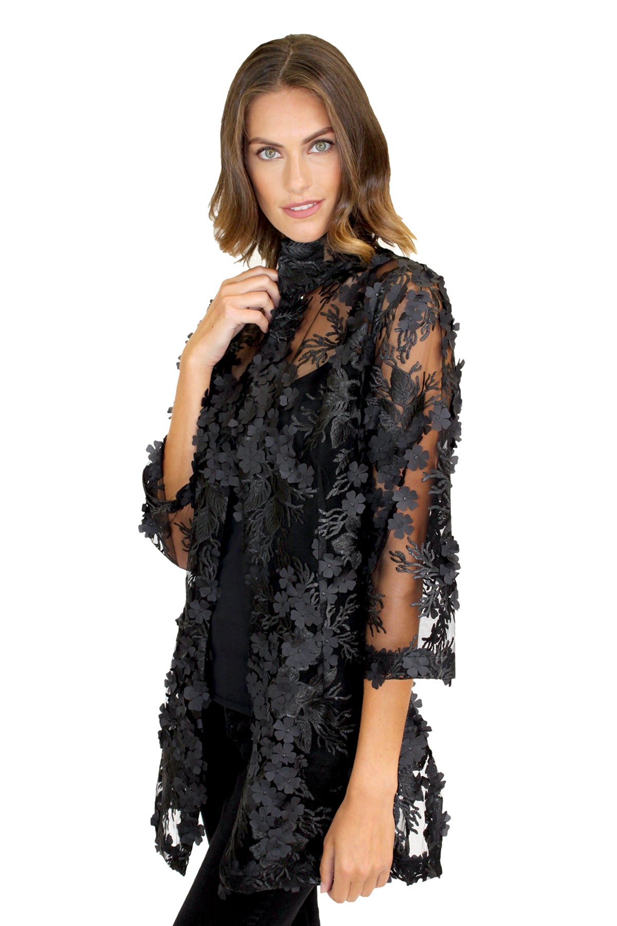 Our Fabulous Floral Applique Organza Fabric in the Tunic Length 3/4 Sleeve Rita Jacket.